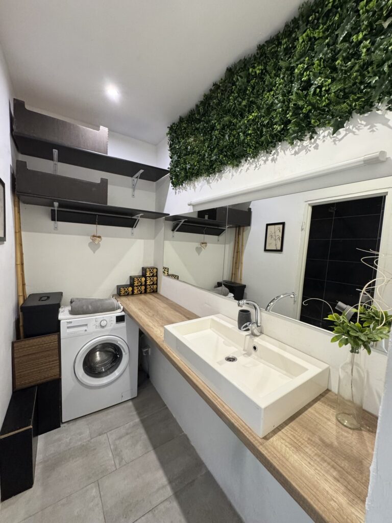 • the entrance to the bathroom is interestingly designed with storage space, washing machine and sink, práčkou a umývadlom